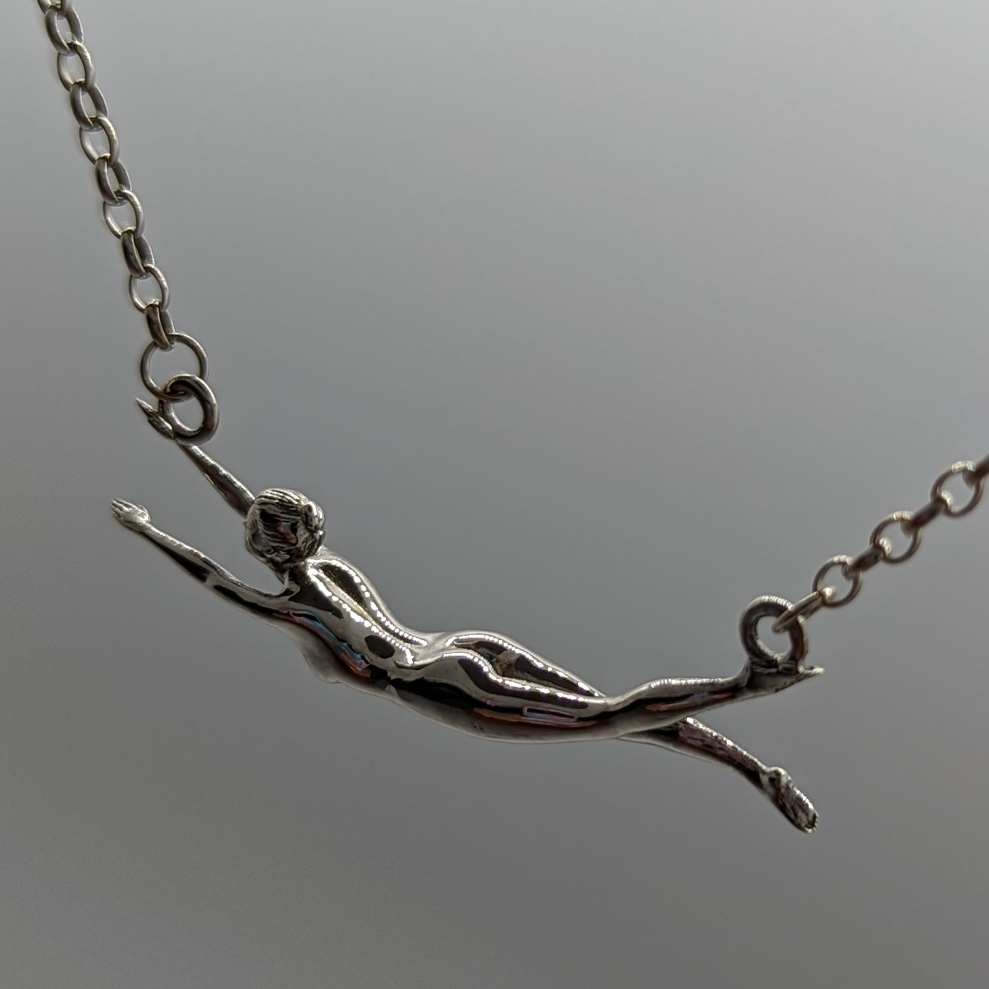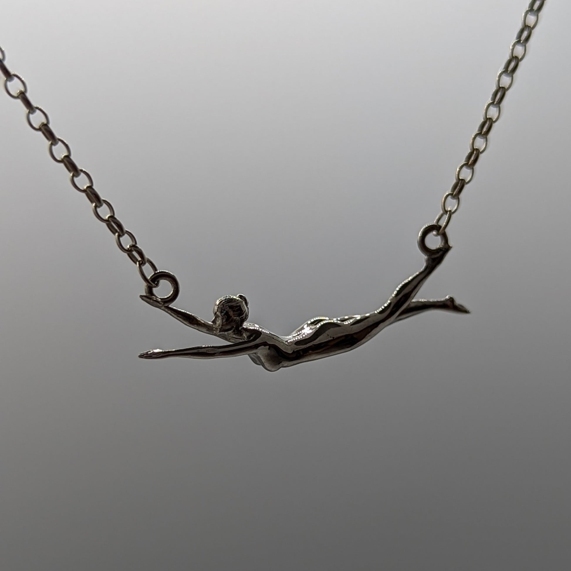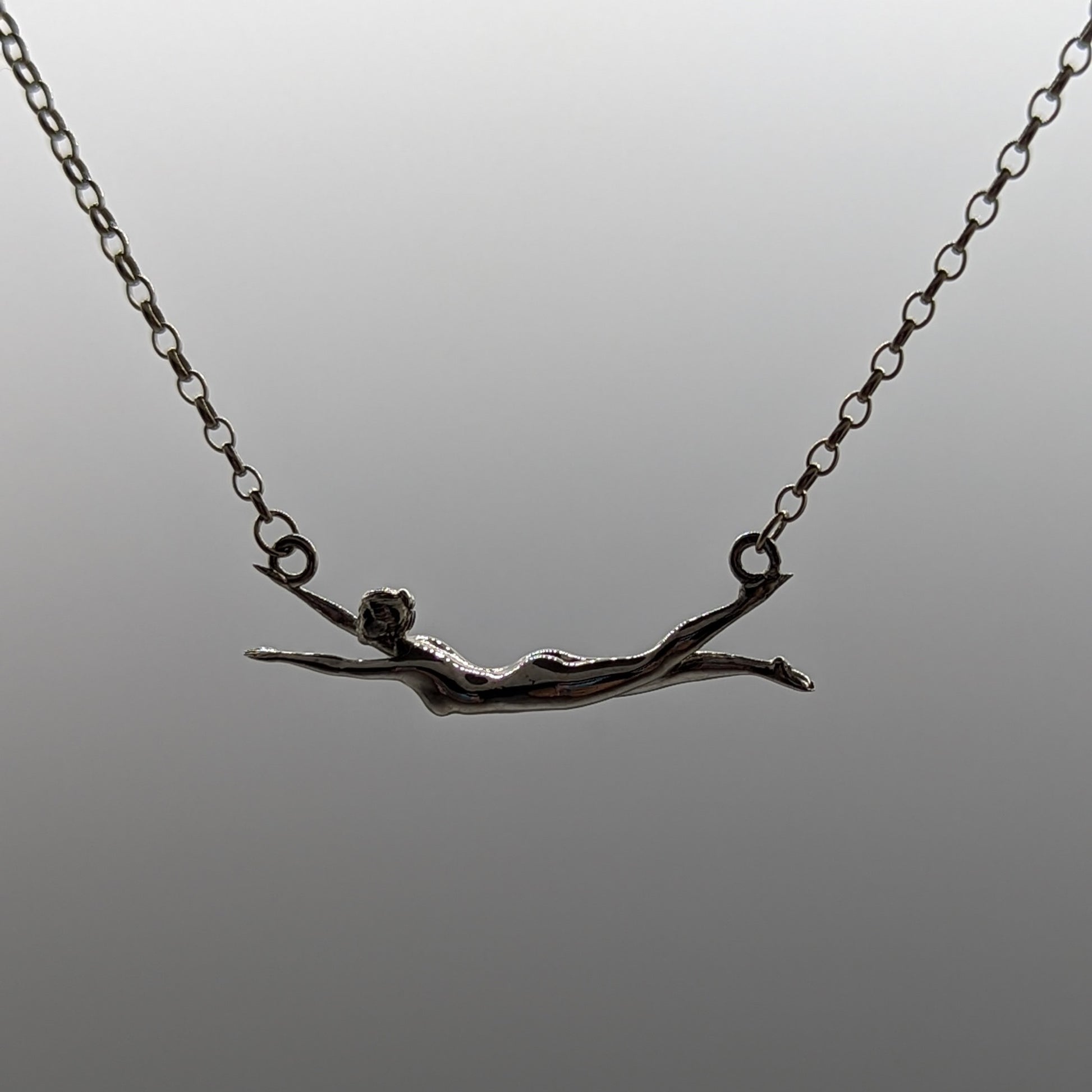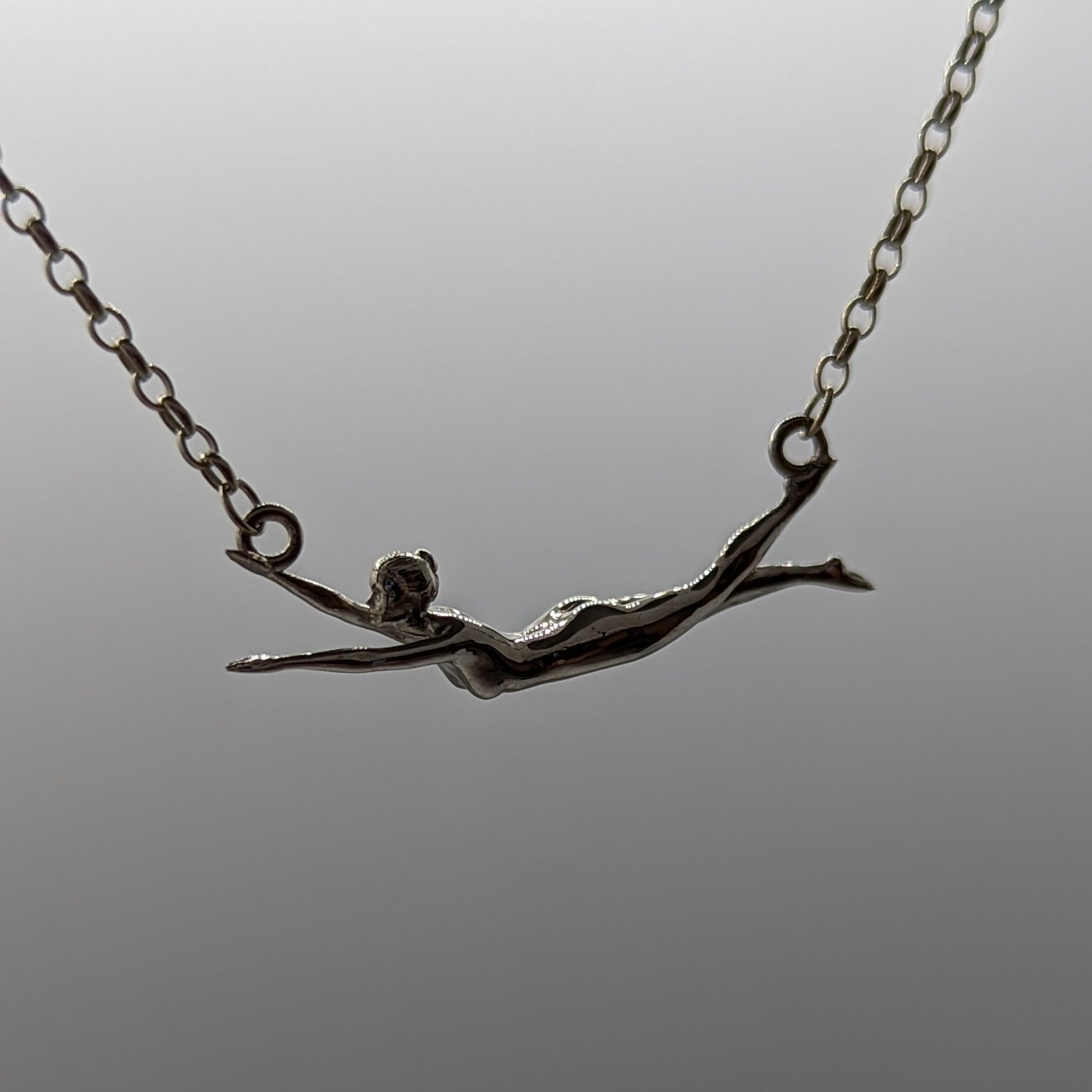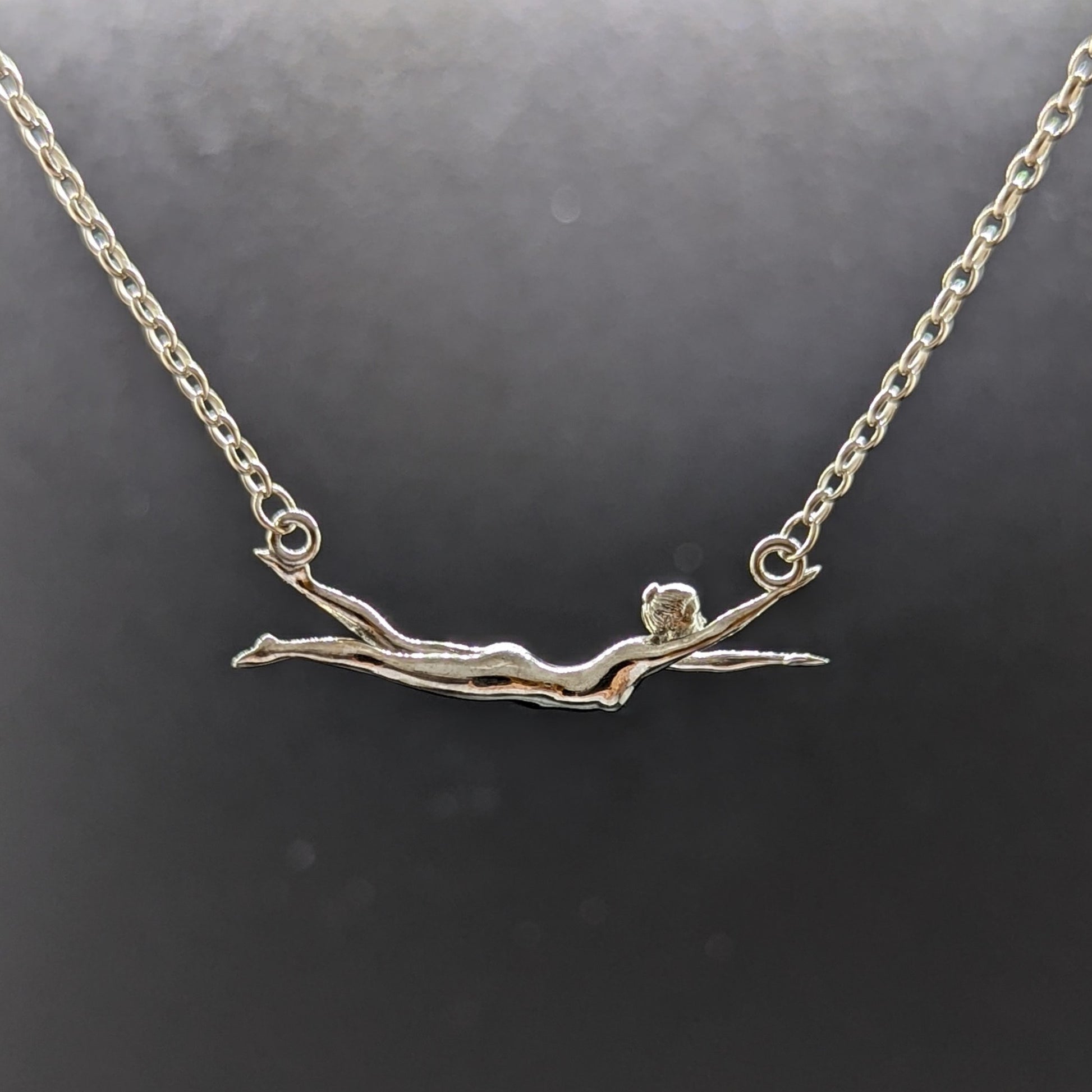 Rhodium plated Pilates Swimming necklace on 15" chain with 3" extension